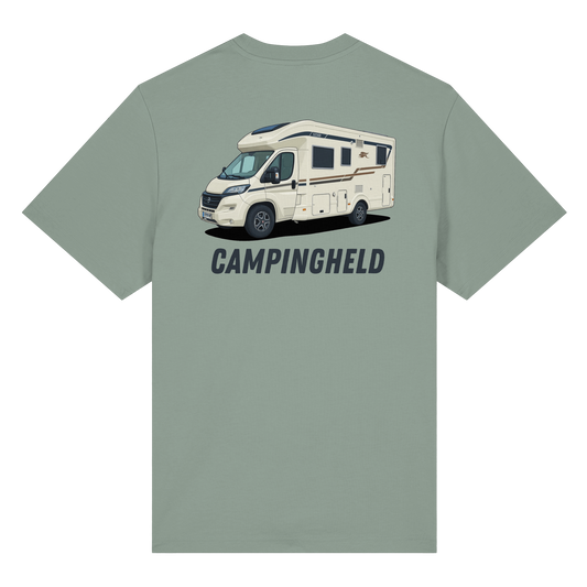 Organic Shirt "Catch My Camper Grey" - Logo vorne, hinten bedruckt mit Deiner Camper Illustration